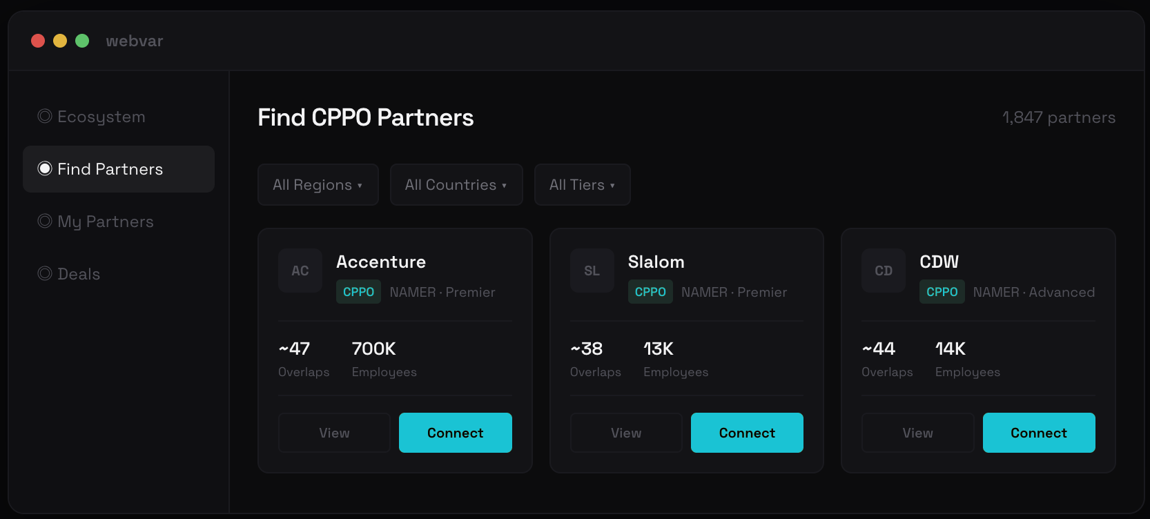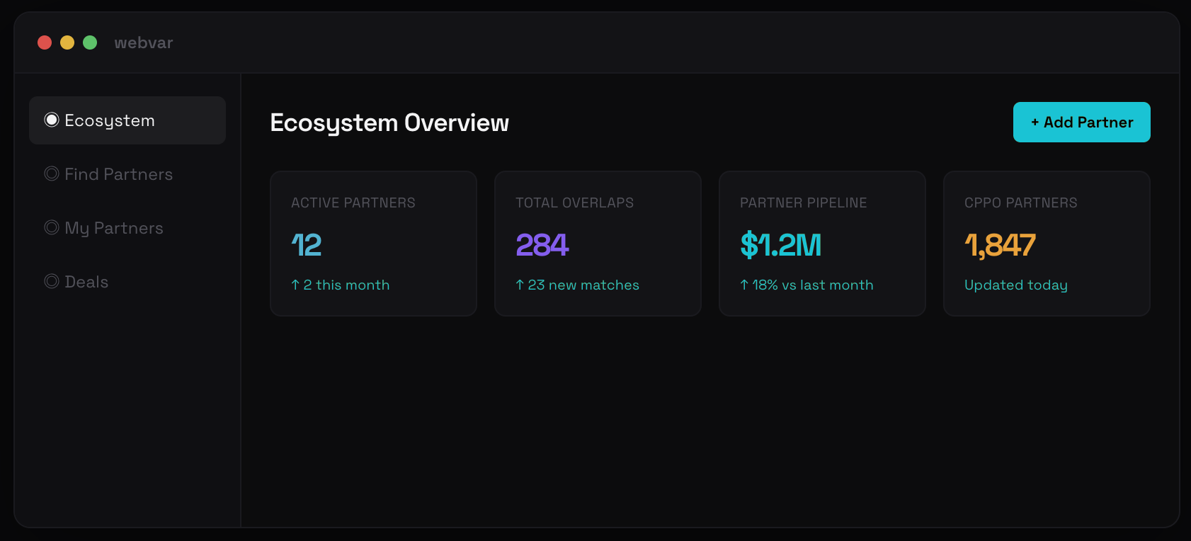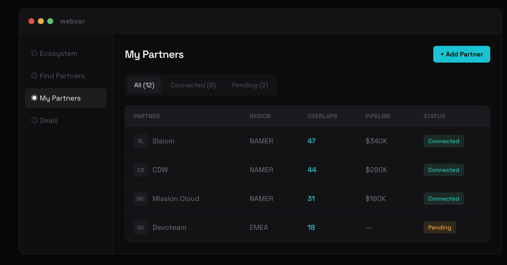 "Webvar helped us identify 3 reseller partners we'd never considered. Within 60 days, one of them sourced a $400K deal that closed through Marketplace."